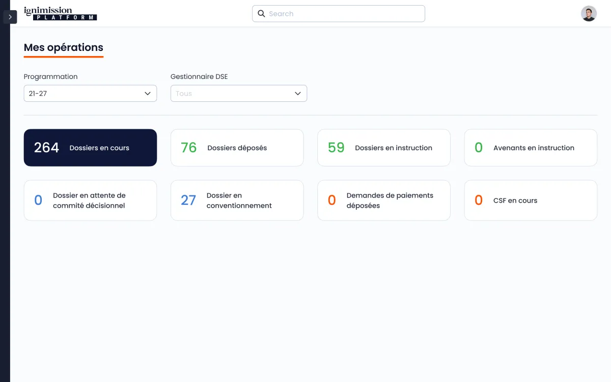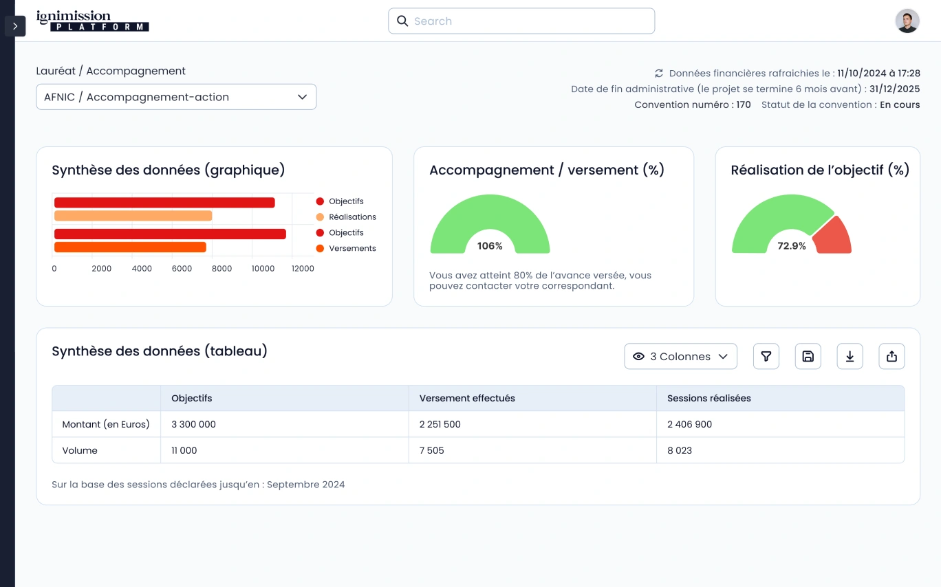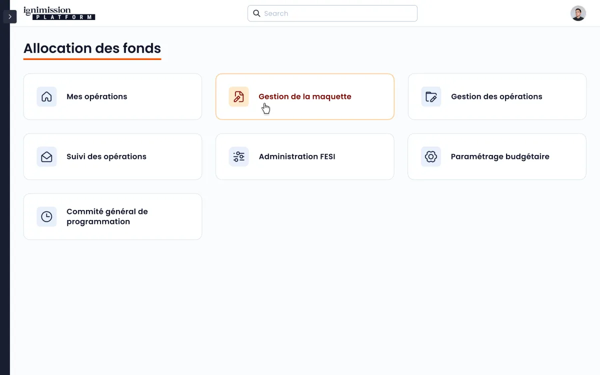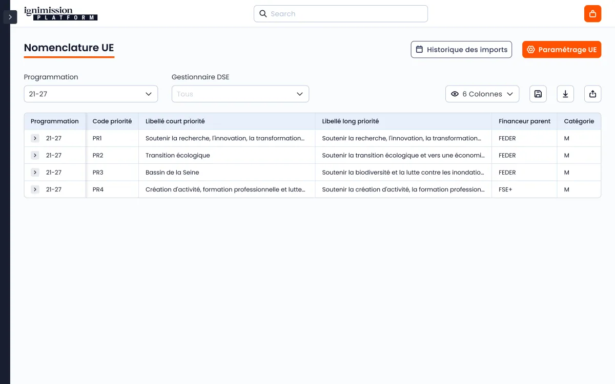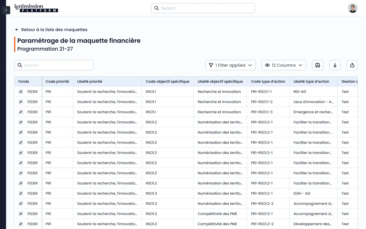 Ignimission Platform permet de configurer facilement les priorités de financement et leurs sous-chapitres, offrant une adaptation précise aux différentes structures de financement et objectifs stratégiques. Cette flexibilité assure que l’application répond aux besoins spécifiques de chaque entité publique, quelle que soit sa structure ou ses priorités.