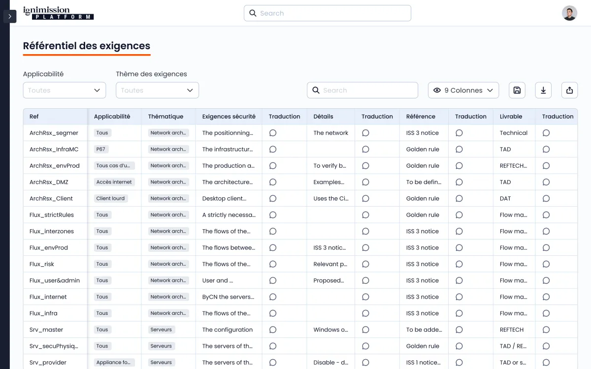 L’application ISP Ignimission fournit un dashboard intuitif offrant une vue globale sur tous les projets et leur taux de couverture sécurité. La synthèse des spécifications de sécurité, l’évaluation dynamique du niveau de criticité, et la liste détaillée des fichiers cyber permettent un pilotage précis et en temps réel de la sécurité des projets, facilitant ainsi la prise de décision et l’amélioration continue de la posture de sécurité.