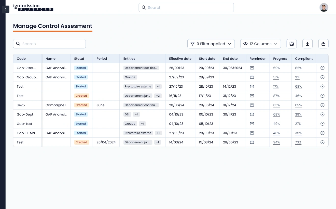 Lancez et gérez facilement des campagnes d’évaluation de conformité. Définissez le périmètre, la durée, et configurez des alertes automatiques. Suivez la progression et le taux de conformité en temps réel pour chaque campagne.