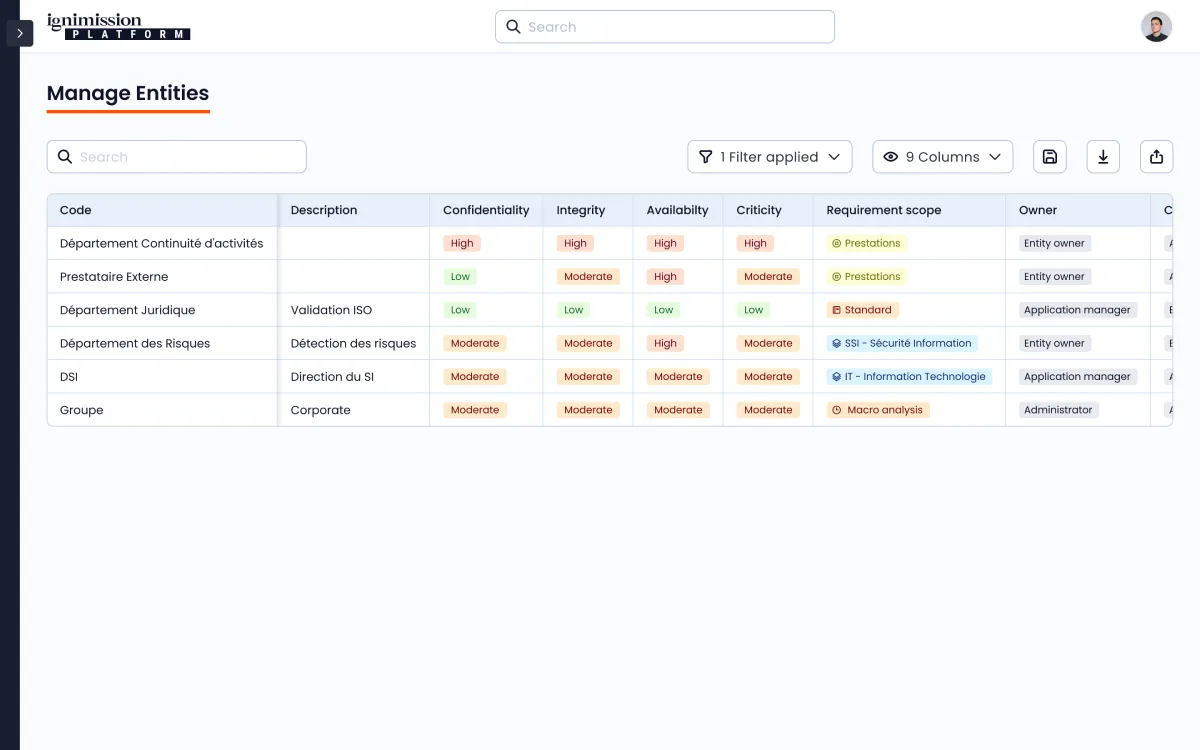 Ignimission optimise le pilotage des Security Assessments grâce à sa plateforme intégrée : formulaires paramétrables, automatisation des notifications, suivi en temps réel, vue détaillée des évaluations et tableaux de bord personnalisables pour une gestion efficace des campagnes de contrôle de sécurité.
