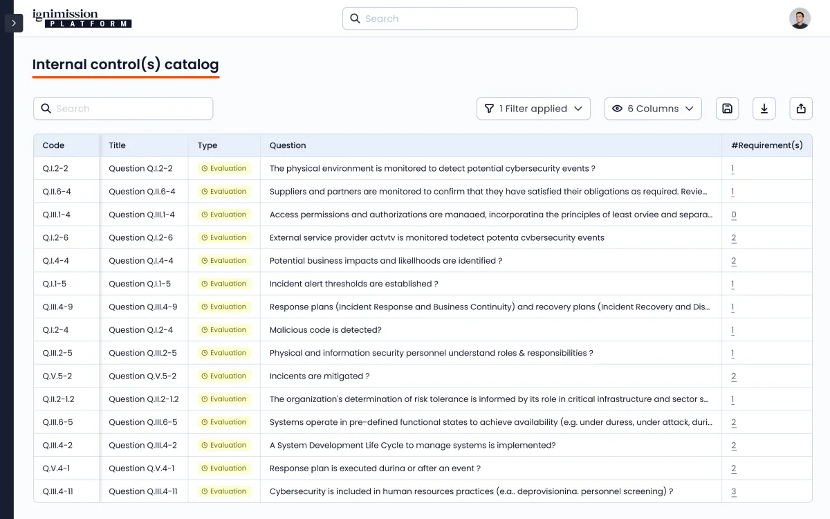 L’Application de Conformité Réglementaire d’Ignimission simplifie la mise en conformité et le suivi continu pour DORA, NIS 2, ISO et autres cadres réglementaires. Notre solution No-Code s’adapte à votre organisation, centralisant les données et automatisant les processus d’évaluation. Elle facilite la collaboration entre équipes, offre une visibilité en temps réel et permet de générer rapidement des preuves de conformité pour les régulateurs comme l’ACPR. Avec Ignimission, transformez votre approche de la conformité en un processus efficace, proactif et durable dans le temps.