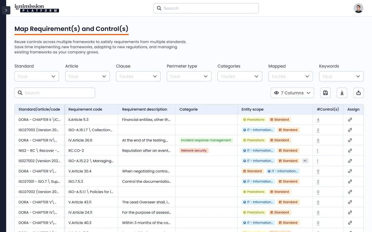 Notre système de mapping permet d’associer les exigences de différents frameworks, évitant ainsi la duplication des efforts. Par exemple, une réponse à un contrôle interne peut automatiquement satisfaire des exigences de plusieurs frameworks comme DORA ou ISO, optimisant ainsi le processus de conformité.