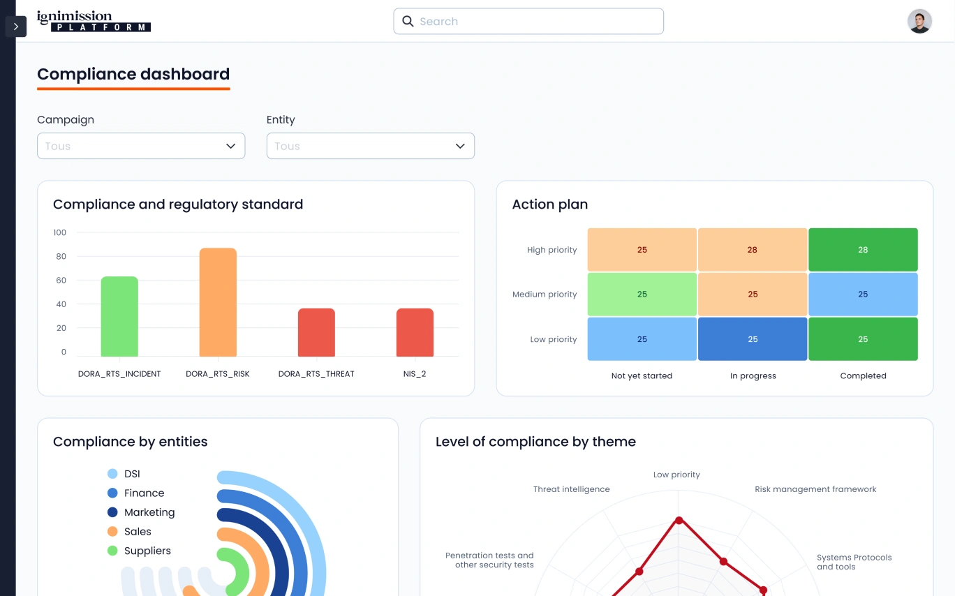 L’Application de Conformité Réglementaire d’Ignimission offre une solution complète pour la mise en conformité et le suivi continu des exigences DORA, NIS 2, ISO et d’autres cadres réglementaires. Notre approche intégrée 360° transforme la gestion de la conformité en un processus fluide, de l’évaluation initiale à l’amélioration continue de votre posture de conformité.