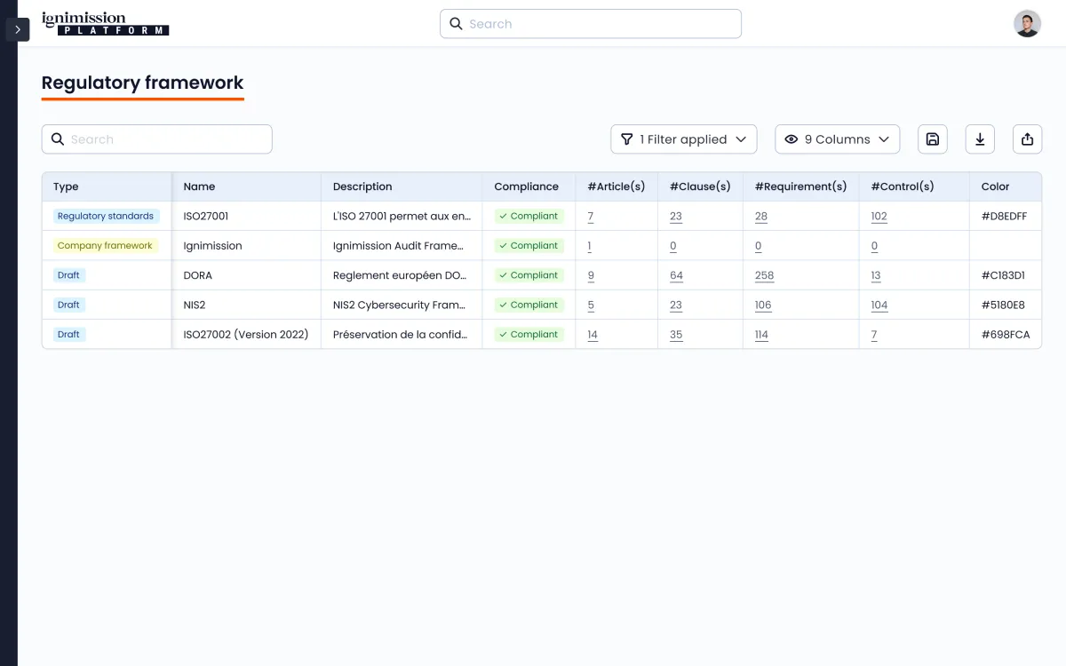 Notre application permet d’importer des frameworks réglementaires de diverses manières : manuellement, via des fichiers Excel, ou par connexion API directe à la source. Cette flexibilité permet d’intégrer facilement des référentiels de contrôle interne, ainsi que des frameworks régulatifs ou normatifs tels que DORA, NIS 2, ISO, structurés en articles, clauses, exigences et contrôles.